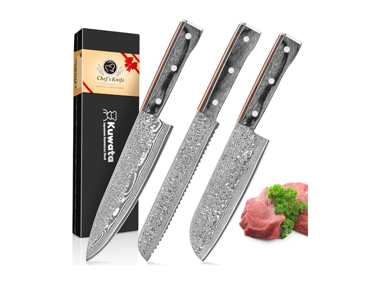 - (1) Kuwata Damascus Knife Set, 3PCS Professional VG10 Damascus Steel Kitchen Knife Set with G10 Ergonomic Color Wooden Handle, Cooking Knife Set Elegant Gift Box for Home Restaurant
