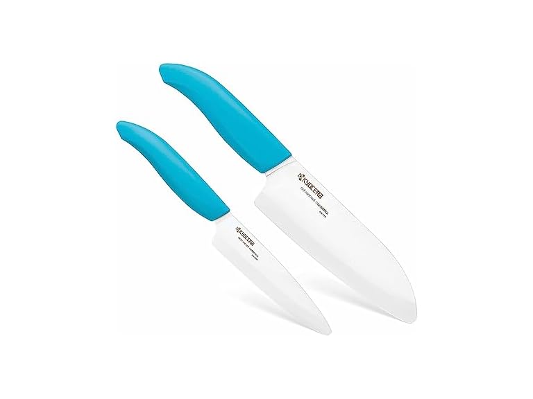 - (1) KYOCERA Revolution 2-Piece Ceramic Knife Set: Chef Knife For Your Cooking Needs, 5.5" Santoku and 4.5" Utility Knife, White Blades with Blue Handles, White/Blue