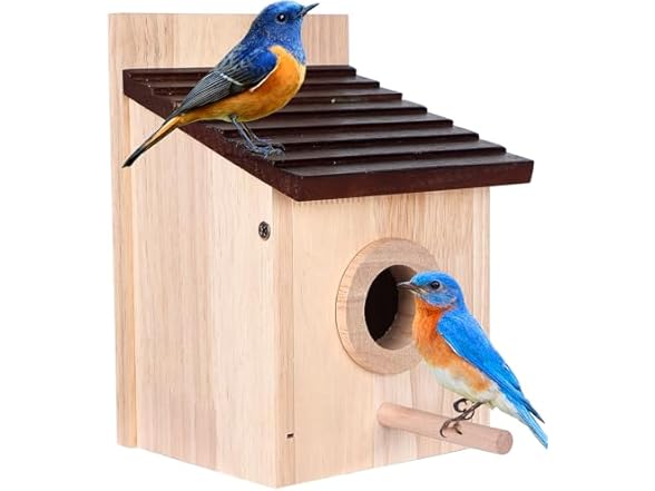 - Natural Wooden Bird House: Handcrafted with pine wood build quality, the wooden birdhouse is great sturdy, and Novel in shape. which has a more natural taste and easier to attract birds to build their nest. Our birdhouses are fully vented and sealed for long-lasting weather protection. this nesting box is not only enhancing your backyard décor but also welcoming small birds like Wrens, Sparrows, Finches, and Bluebirds to your garden.