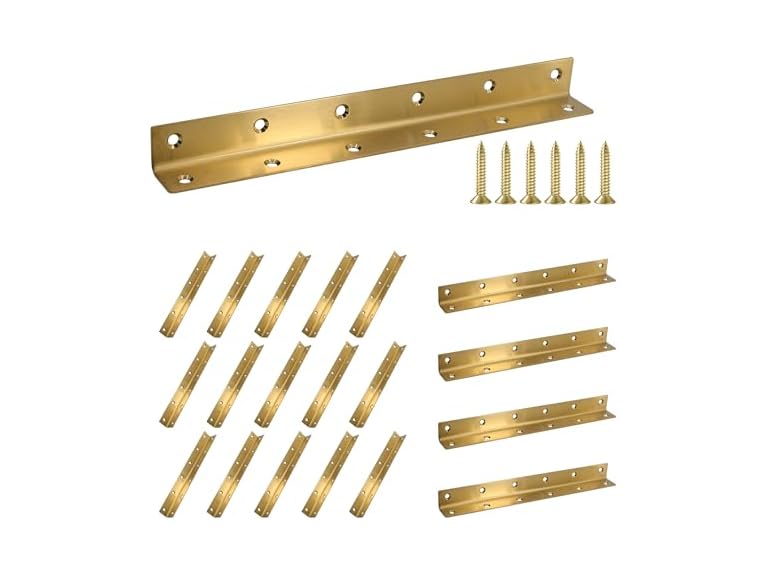 - Material: The L bracket is made of quality metal with a gold textured smooth coated surface, burr-free, well painted, and the hole spacings seem very uniform, ensuring anti-rust and durability. It's 90° L bracket + 12 holes design easy and safe to install. The screws are made of quality iron, it will not easy to broken