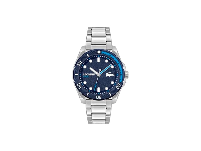 - The diving-look watch gets an attention-grabbing update courtesy of the Lacoste Finn, a sporty three-hand timepiece with a textured bezel crafted in recycled ocean-bound plastic. A mix of color-filled circular and stick indexes plus a Lacoste crocodile and logo make a bold statement on the grained dial, while both the dial and bezel feature bright pop-color details. The choice of the man who likes his style to stand out, the Finn is fitted with a structured silicone strap or metal link bracelet.