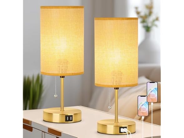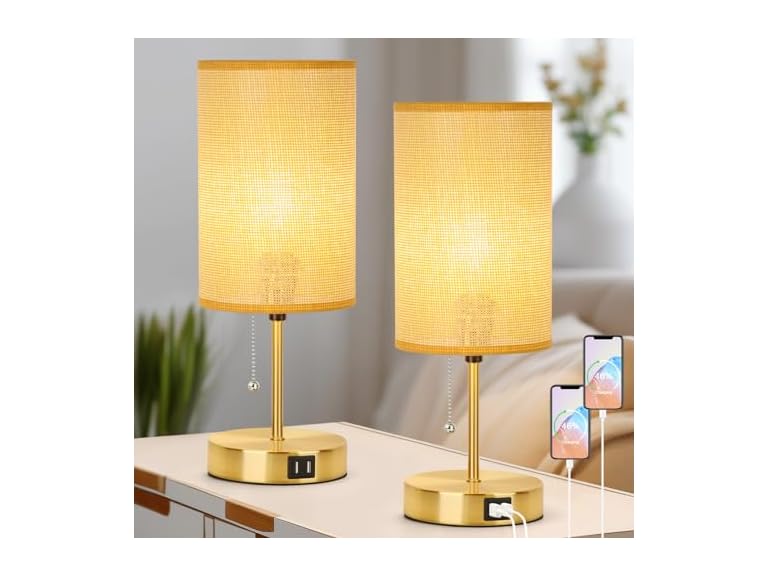 - (1) Set of 2 Table Lamp with 2 USB, Vintage Bedside Lamps for Bedrooms, Nightstand Lamps with Pull Chain, Bamboo Woven Desk Lamps with Rattan Lampshade and Gold Metal Base for Bedroom Living Room Desk