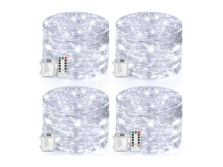 In the Box: (1) 4 Pack 100 LED Fairy Lights Battery Operated with Timer & Remote, 33FT Waterproof Twinkle Lights Indoor Outdoor, Fairy String lights for Bedroom Classroom DIY Wedding Christmas Decorations, Cool White
