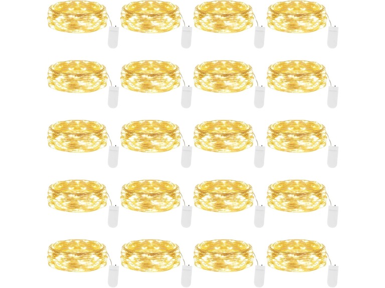 In the Box: (1) Lakumu Fairy Lights Battery Operated -7FT 20LED String Lights Waterproof Silver Wire, Warm White, 20 Pack