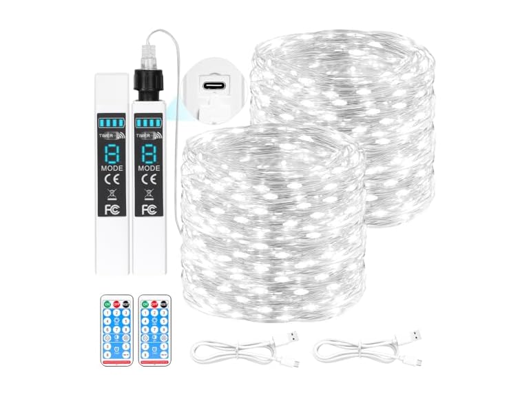 - Complete 2-Pack Set with Extended Length: Each box includes two battery string lights, two rechargeable power banks, and two remote controls. Each twinkle lights battery operated is 66FT long, with 200 vibrant LED beads, ensuring you have plenty of light to brighten any space, indoors or outdoors