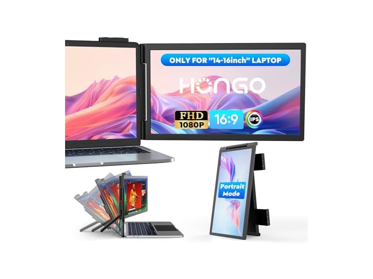 - 【Outstanding Visual Quality】 - The HONGO laptop screen extender boasts a 14-inch FHD IPS display with enhanced brightness up to 300 nits, paired with a 1920x1080P resolution and 1000:1 contrast ratio for superior image clarity. Also users can customize their screen display to suit their preferences, creating a personalized and immersive visual experience. It auto-adjusts between landscape and portrait with a quick OSD setting change, providing an ideal display for any task.Portable and compact, it offers a wide tilt range, doubles as a stand, and folds neatly to fit into slim bags, making it perfect for travel. Boost productivity and enjoy a vivid viewing experience on the go.