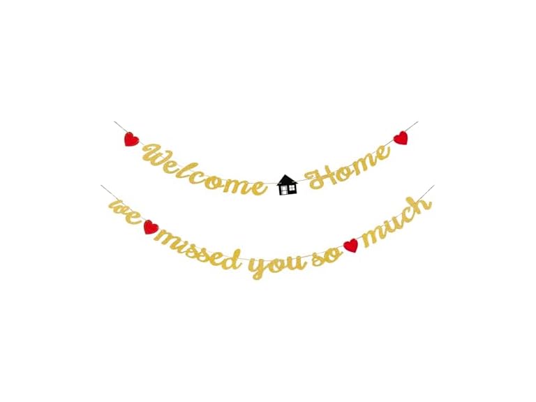 - (1) Fexovirs Large Glitter Welcome Home Banner and We Missed You So Much Banner (Pre-Strung), Gold, Welcome Home Decorations for Homecoming, Family Reunions, Military Homecomings, Surprise Parties