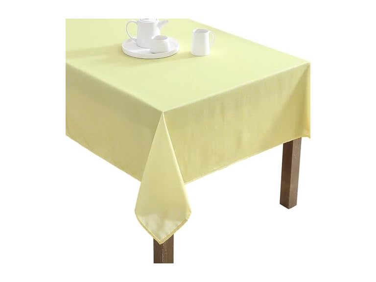 - (1) Laura Ashley Decorative Tablecloth, Wrinkle and Stain Resistant, Spillproof Water Repellent, Easy Care Washable Polyester Fabric for Dining, Kitchen, Holiday and Party, 60" x 84", Yellow
