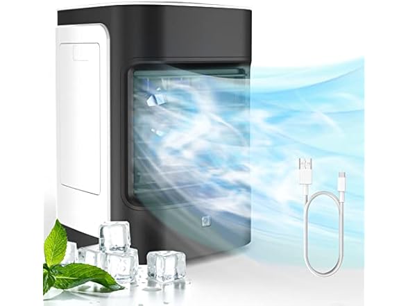 - (1) Evaporative Portable Air Cooler, 100° Oscillating Mini Air Conditioner, 3 Speeds, 7 Color LED Lights, USB Powered, Personal Mini Fan For Bedroom Table Office Outdoors