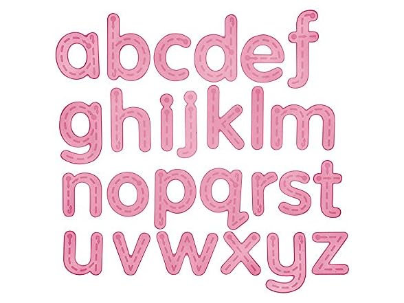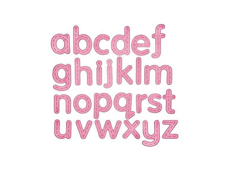 - Transparent pink silicone letters in a rounded, child-friendly font