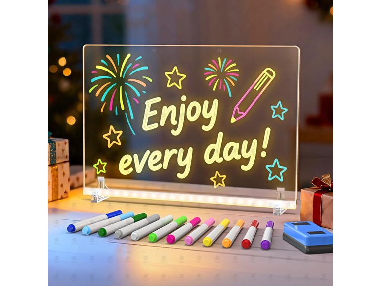 - 12 Vibrant Fluorescent Markers Included: Equipped with 12 colorful fluorescent pens, eraser, and spray bottle for mess-free doodling, allowing kids and teens to unleash their imagination on this glowing LED drawing board toy—perfect for home family messages, kids' drawing sessions, or daily schedule notes.