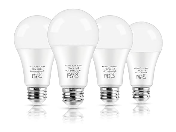 In the Box: (1) LED Light Bulbs, 100 Watt Equivalent A19, 13W 5000K Daylight White 1500 Lumens Non-Dimmable Bright E26 Edison Medium Screw Bulbs for Home Bedroom Kitchen Living Room Office Lamp, 4-Pack