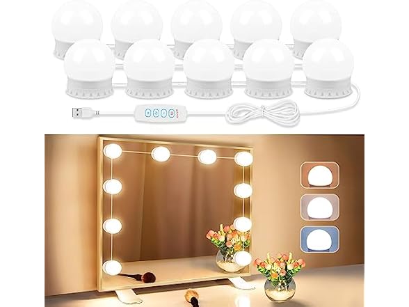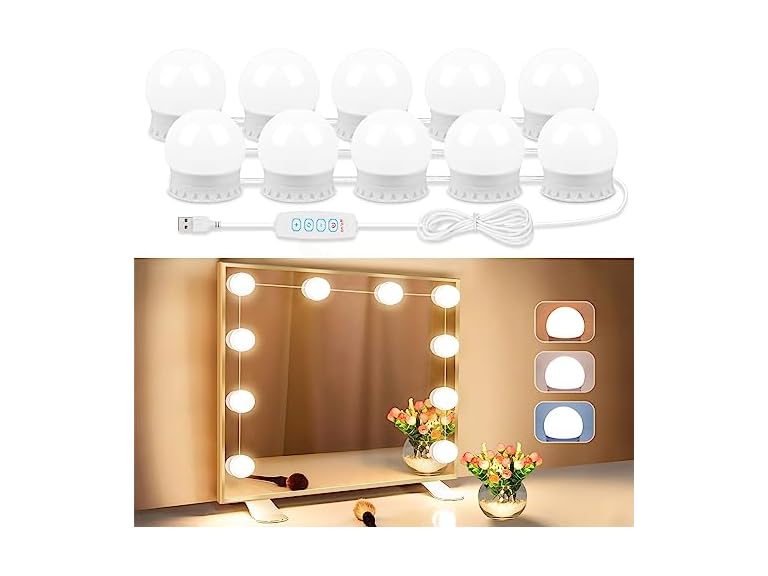 In the Box: (1) LED Vanity Lights For Mirror, Vanity Lights Stick on with 10 Dimmable Bulbs, 3000K 4000K 6500K & 10 Level Brightness Adjustable, USB Cable, Hollywood Mirror Lights