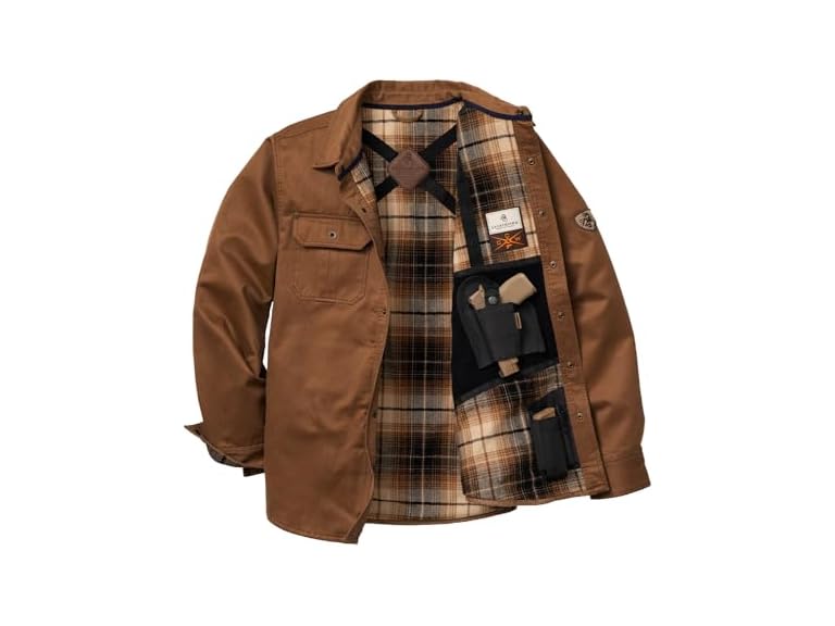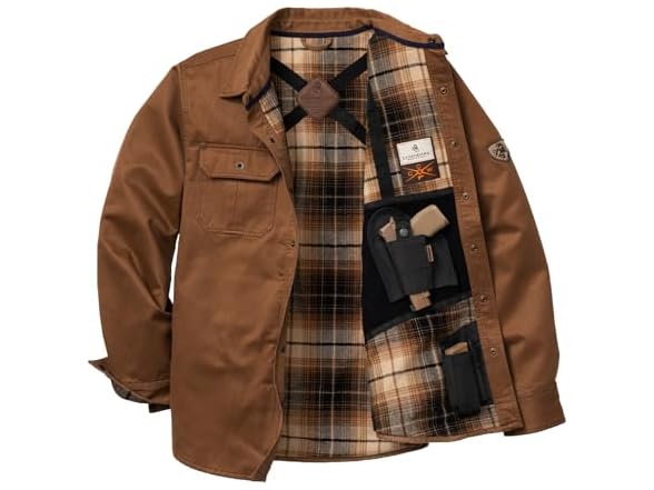 - Classic shirt jacket styling with waxed canvas for a casual appearance. Regular fit coat features cozy flannel lining, taffeta polyester lined sleeves, and four pockets. Featuring our patent-pending crisscross shoulder harness design with two repositionable holsters for handguns as well as two pockets to hold onto your magazines for the perfect right or left handed draw.