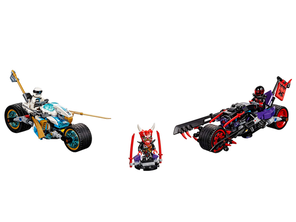 Match Zane’s bike against Mr. E’s Oni Bike and battle for the Oni Mask of Vengeance, with this exciting LEGO® NINJAGO® 70639 Street Race of Snake Jaguar set. Titanium Ninja Zane’s bike features 2 foldout gold-colored blades, 2 hidden stud shooters on a foldout detachable drone for ground-level or aerial attacks, while the Oni Bike is armed with chopping blades and 2 stud shooters. This cool toy for kids also includes a podium with Oni Mask of Vengeance and Demon Torso elements for the Mr. E minifigure to wear, plus 2 minifigures with weapons to intensify the role-play conflict.