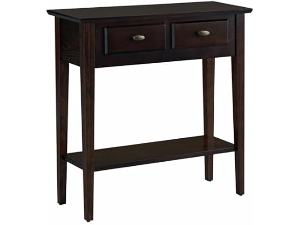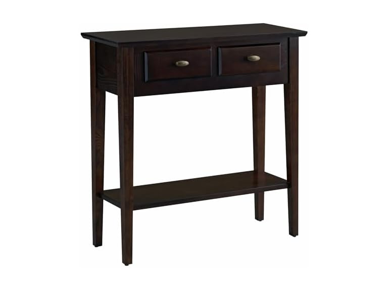 The Teegan Solid Wood Hall Entryway Console Table by Leick Home brings functional elegance to entryways, hallways, foyers, and living rooms. Featuring a space-saving design at just 11 inches deep, this narrow console table is ideal for small spaces while offering ample storage and style. The rich chocolate oak brown finish enhances the natural wood grain, while the brushed nickel bullet-pull hardware adds a modern touch to the classic design. The natural wood grain varies from table to table, creating one-of-a-kind pieces with unique patterns and rich character. Two spacious solid wood drawers provide discreet storage for keys, mail, and everyday essentials, while the lower shelf offers additional space to display decor, books, or storage baskets. The tapered leg design ensures stability and an elegant profile that complements various decor styles. Measuring 30 inches long, 11 inches wide, and 30 inches high, this console table fits perfectly behind sofas, in narrow hallways, or in compact foyers. Designed for easy assembly, it includes pre-assembled drawers and clear instructions for a quick setup. With a weight capacity of 50 lbs., this sturdy table is built to last and support your everyday needs. Trust Leick Home’s 150+ years of craftsmanship, backed by a 1-year limited warranty, to deliver quality and timeless design to your home.