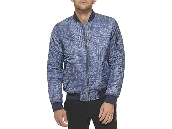 - (1) Levi's Men's MA-1 Flight Lightweight Zip-Up Bomber Jacket, Faded Blue Bandana MA-1 Filled, Small