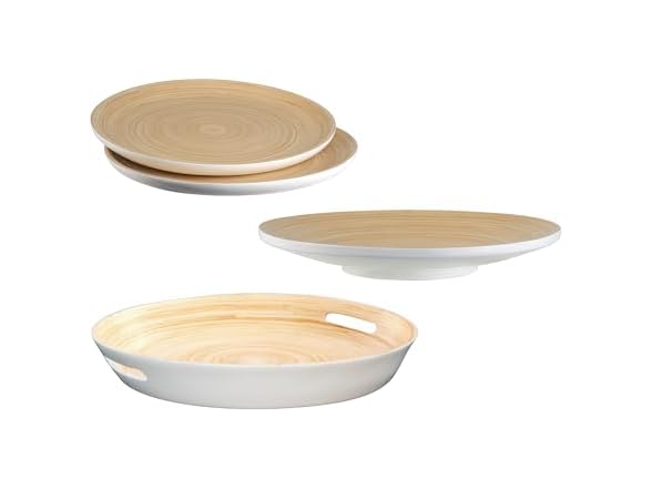 - LEXA 4-Piece Handcrafted Bamboo Serving Set, Extra-Large 16” Tray with Handles, Two 12” Serving Plates & 12” Footed Plate, Spun Bamboo Entertaining Set, Artisan-Made for Serving & Home Décor (White)