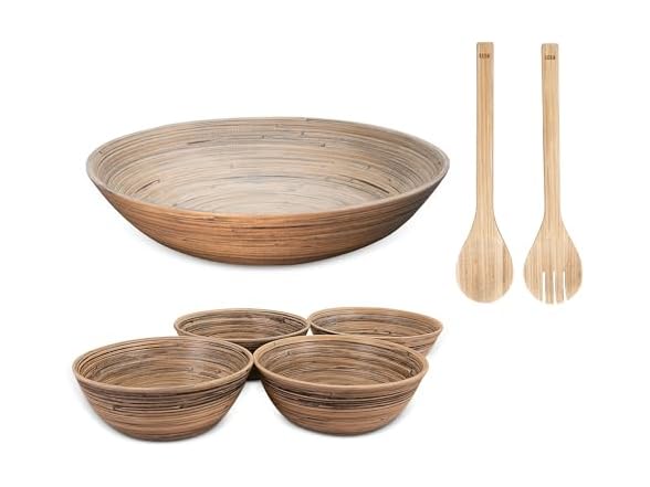 - LEXA 6-Piece Handcrafted Bamboo Salad Bowl Set, Large 14 in Serving Bowl, Four 8 in Side Bowls & Salad Utensils, Artisan-Made Spun Bamboo Dinnerware for Entertaining, Serving & Home Décor (Black)