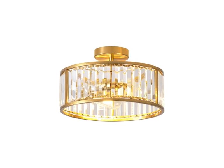 - (1) LHLYCLX black flush Mount ceiling light, 3- lights caged crystal chandelier, small drum hallway light fixtures ceiling Mount, 14 INCH Brass Gold (3-Lights)