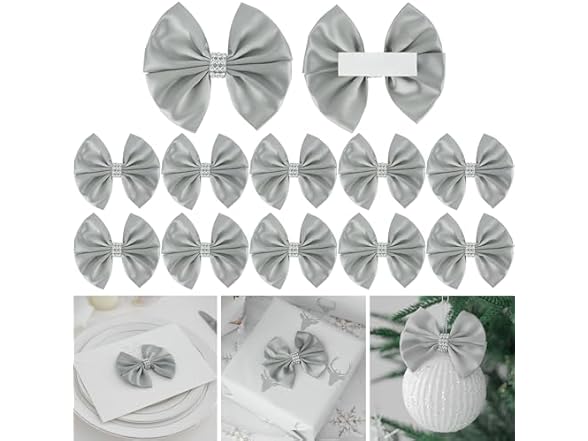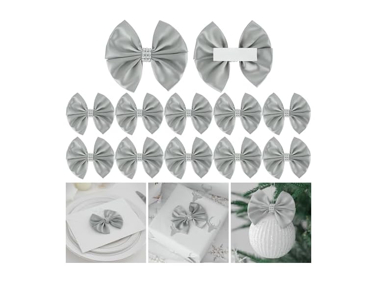 - (1) LiBongTa 3.5" Silver Bow Premade Bows, Satin Ribbon Bows for Presents, Self Adhesive Bows with Rhinestone, Christmas Bows for Gift Wrapping, Treat Bags, Decor Accessories, Party Favors-12 Counts