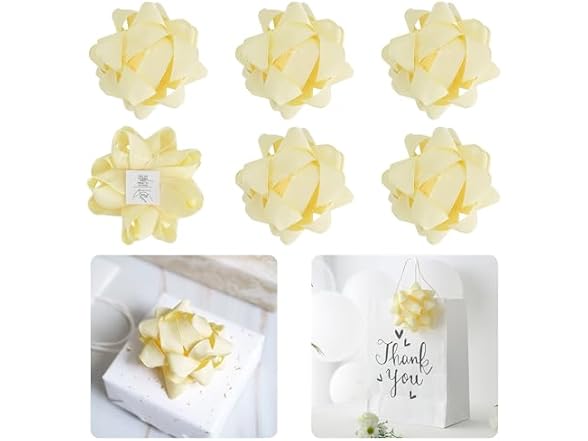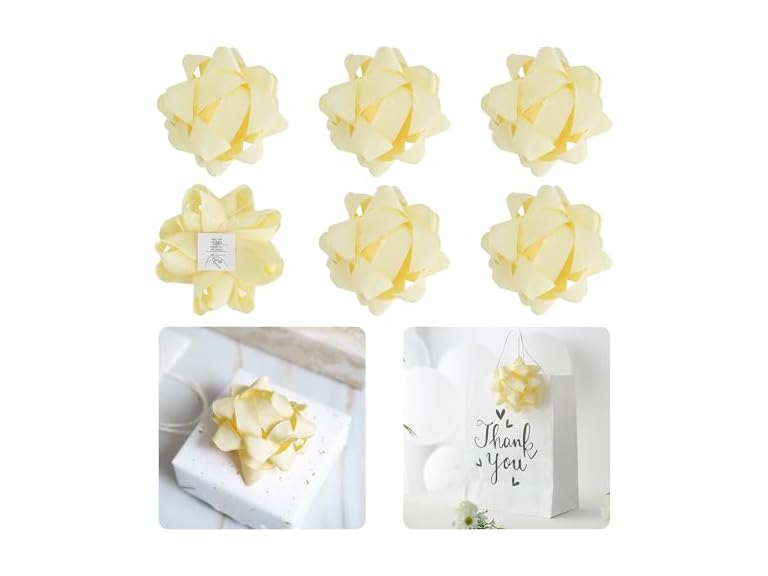 - (1) LiBongTa 4.5 Inch Ivory Bow for Gift Grosgrain Ribbon Present Bow, Baby Shower Bow for Gift Wrapping, Decorative Bow, Self Adhesive Bows, Gift Bow Assortment, Pack of 6
