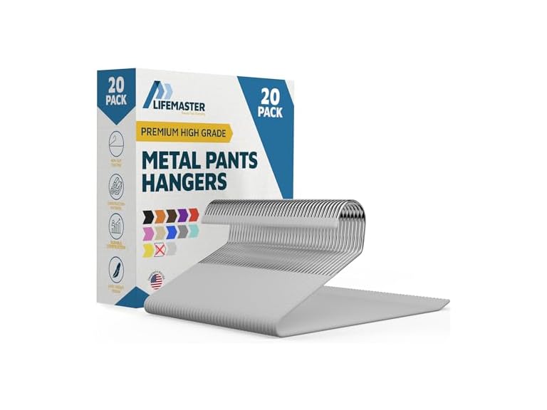 - (1) Lifemaster Metal Pants Hanger Set - 20 Pieces Elegant Non-Slip Closet Space Saving Hanger Set for Pants, Trouser, Blankets, and Jeans with Open Ended Sleek Design - White