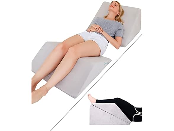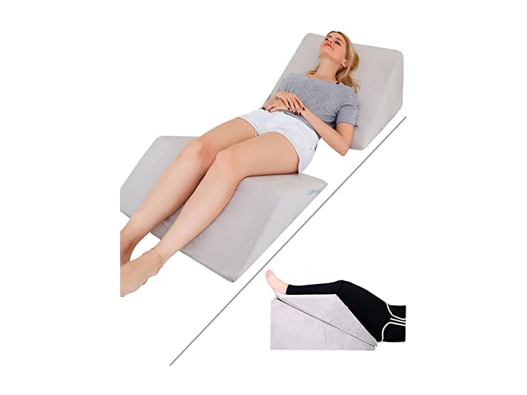 - 【2 Separated Foam Wedge Pillows - More Versatile】:The Bed Wedge Pillow can be used under the head, and the back. Measuring 23.6” wide and 12” high, the wedge easily fits on any bed, providing additional comfort and support while SITTING or SLEEPING. The Leg Wedge Pillow relieves discomfort and pressure in the legs, knees, hips and lower back. You could ASSEMBLE the 2 pillows in any way, and place to any place you like