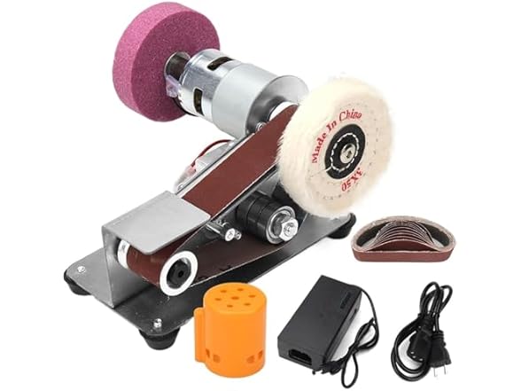 - Building Kit: By installing grinding and polishing wheels on the left and right sides of the belt sander, you can quickly build a mini bench sander with sanding belt and speed adjustment function, which is great for jewelry making, resin artwork and knife making tools.