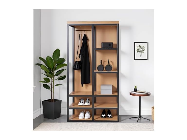 - MULTI-FUNCTIONAL STORAGE FOR COATS, SHOES & MORE – Keep essentials in order with a metal hanging bar, 4 bottom shelves for shoes, and 3 side shelves for bags, hats, or bins. Ideal for organizing jackets, backpacks, scarves, umbrellas, and pet leashes.