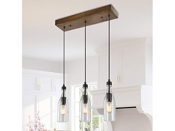 - MATCHES MULTI-STYLES. Featuring a solid rectangle wooden canopy which holds 3 clear bottle-inspired glass shades, attached by 3 height adjustable cords, this 3-light pendant matches your space whether it is transitional, industrial, modern or farmhouse style! It is guaranteed to fill your space with lights and joy!