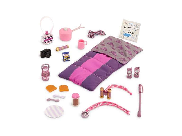 - Includes: This playset comes with a sleeping bag, camera, hiking stick, walkie-talkies, flashlight, lamp, rope, canteen, binoculars, compass, box of bandages, map, plate, toasts, peanut butter jar, sporks, pot, and a mug.