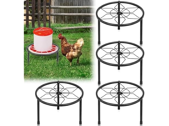 - (1) LOTKEY 4 PCS Metal Stand for Chicken Feeder Waterer, Chicken Feeder Stand with 3 Legs, Chicken Coop Accessories, Iron Stand Holder for Chick Feeders Bucket, for Coop Poultry Indoor Outdoor