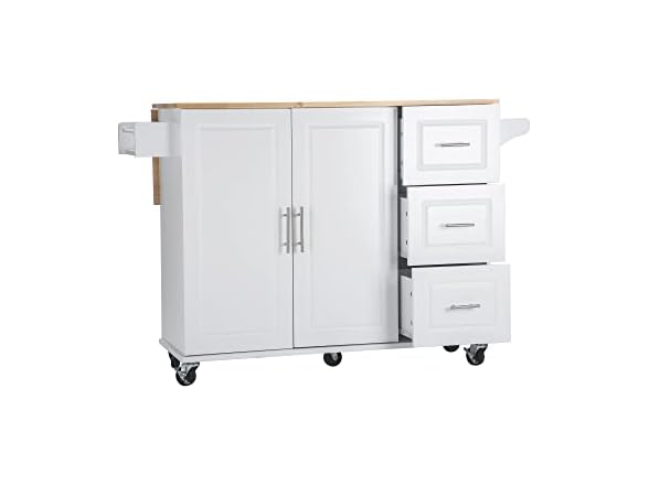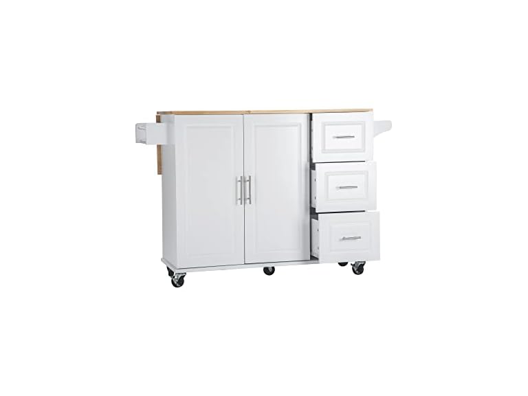- (1) Lovtimber Kitchen Island Cart with Storage Cabinet, Extensible Rubber Wood Tabletop, Adjustable Shelf, 3 Big Drawers, Spice Rack, Towel Rack, White