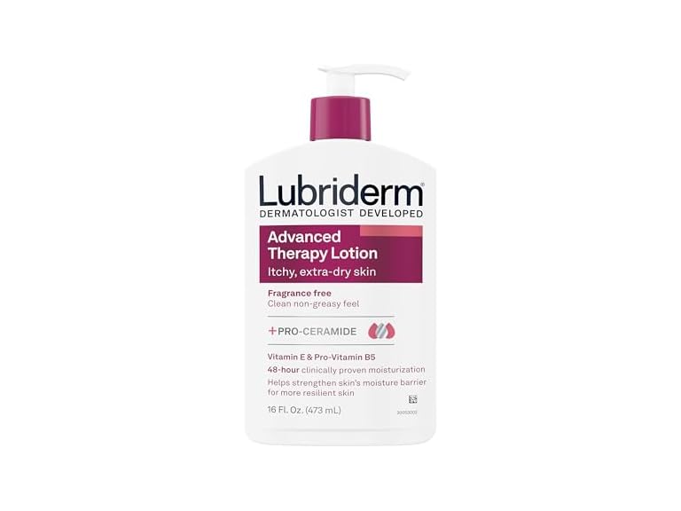 - 16-fluid ounce bottle of Lubriderm Advanced Therapy Fragrance-Free Daily Moisturizing Lotion + Pro-Ceramide with Vitamin E and Pro-Vitamin B5 itchy, extra-dry skin to help strengthen skin’s moisture barrier