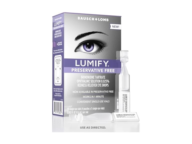 - LUMIFY Preservative Free Eye Drops for Red Eyes, Redness Reliever for Sensitive Eye, Brighter and Whiter Looking Eyes, Works in 1 Minute & Lasts Up to 8 Hours, 20 Single-Use Vials
