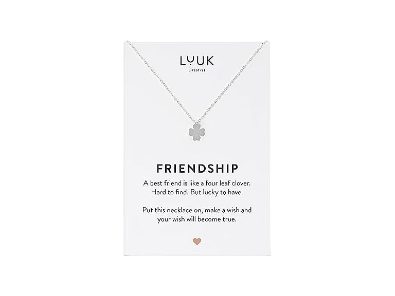 - (1) LUUK LIFESTYLE Stainless steel 20” necklace with clover pendant and FRIENDSHIP gift card, birthday gift idea for women, symbol of luck, lucky charm for exams, travel talisman, silver
