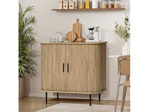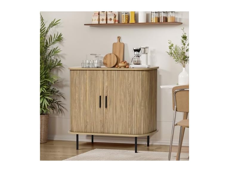 - Mid Century Modern Style: This small accent cabinet embrace the mid century modern style with minimalist aesthetics. Our sideboard buffet cabinet with storage also designed with curved edges and slatted sliding door to effortless gliding.