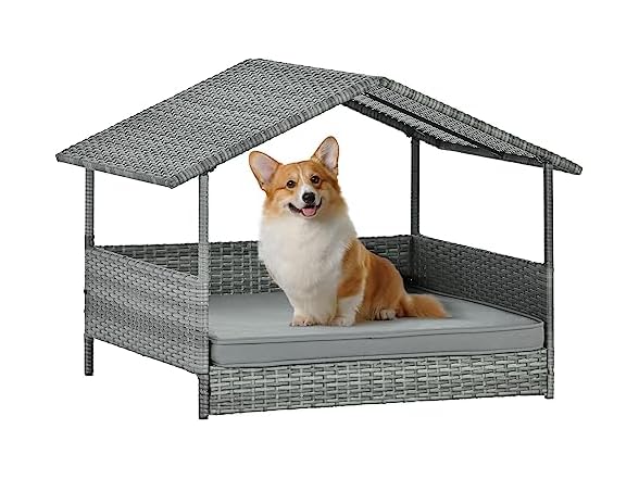 - (1) Lyromix Wicker Dog House with Canopy, 32" Outdoor Elevated Rattan Dog Bed with Water-Resistant Soft Cushion, Large Outside Raised Dog Shelter for Small, Medium Dogs, Gray