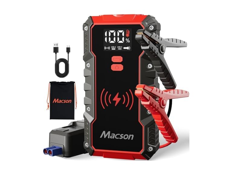- Macson Car Jump Starter, 3000A Jump Starter 59.2Wh Battery Pack for (9L Gas/ 7L Diesel Engine), 16000mAh PD60W Fast Charge Battery Pack with 10W Fast Wireless Charge, Flashlight for Car Safety