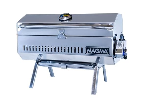 "Introducing the Magma Anacapa Gas Grill, the ultimate portable marine grill expertly crafted for on-board excellence and versatile outdoor cooking. This stainless steel marine grill delivers exceptional even heat distribution and powerful cooking performance, ensuring delicious meals are served effortlessly while you're out at sea. Designed for effortless transport and convenience, the Anacapa features innovative fold-away legs and a locking lid, keeping it compact for all your boat BBQ adventures. It's perfectly ready for a quick picnic ashore or any camping trip. The grill also includes a snap-out radiant plate, ensuring remarkably easy cleanup after preparing memorable meals. The Anacapa boat grill is built for years of dependable use. It comes equipped with a sealed thermometer for precise temperature monitoring and a dependable electronic ignition system, powered by a single “AAA” battery (included) for quick and reliable startups. Its locking control valve/regulator makes boat propane grill fuel exchanges simple and safe with standard 1lb. disposable canisters. This versatile system also easily adapts to existing on-board low pressure propane (LPG) or natural gas (CNG) fuel systems. Customize your compact marine grill for your specific needs with Magma's extensive selection of mounting options (sold separately). Whether for your yacht, fishing boat, RV, or any outdoor setting, the Magma Anacapa is the ideal solution for gourmet grilling on the go.