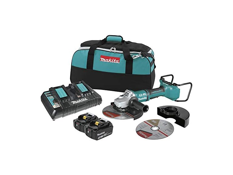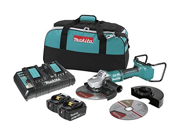 Makita, a pioneer in Brushless motor technology and battery innovation, combines both in the 18V X2 LXT (36V) Lithium-Ion Brushless 9” Paddle switch Cut-Off/angle Grinder with Electric brake. It's powered by two 18V Lithium-Ion batteries for 36V power and performance, and has an electronically-controlled BL Brushless motor that matches torque and RPM to the application. Makita 18V X2 means freedom from the cord, even for demanding applications like grinding and Cut-Off applications that Often call for a corded Grinder. Best of all, users can remain in one battery platform, using the same fast-charging 18V batteries on the Xag13 as they use across the Makita 18V LXT cordless tool system. The Xag13 is equipped with efficiency features for maximum performance. The Electric brake stops the grinding or Cut-Off wheel in 4.5 seconds or less for maximum productivity, and the electronic torque control turns the motor off if rotation speed suddenly slows or the wheel is forced to a stop. For consistent performance, automatic speed Change technology adjust speed and torque during operation. For added comfort, the vibration absorbing back handle is Isolated from the motor housing for reduced vibration, and the soft start feature suppresses start-up reaction for smoother start-ups and longer gear life. It has a No lock-on rear Paddle trigger switch, and the anti-restart protection is engineered to prevent motor start-up when the battery is inserted with the switch locked on. It's part of Makita’s expanding 18V Lithium-Ion system, the world’s largest cordless tool system powered by 18V Lithium-Ion slide-style batteries. Makita 18V Lithium-Ion batteries have the fastest charge times in their categories, so they spend more time working and less time sitting on the charger. For improved tool performance and extended battery life, Makita created Star protection Computer controls. Star protection is communication technology that allows the Star Protection-equipped tool and battery to exchange data in real time and monitor conditions during use to protect against overloading, over-discharging and overheating. For increased versatility, the tool can also be powered by Makita 18V LXT and compact Lithium-Ion batteries with the Star symbol on the battery indicating Star protection inside.
