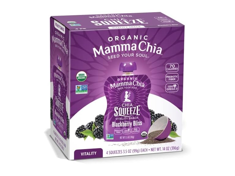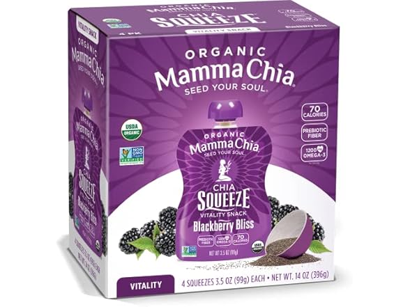 - (1) Mamma Chia Organic Vitality Squeeze Snack, Blackberry Bliss, USDA Organic, Non-GMO, Vegan, Gluten Free, and Kosher. Fruit and Vegetables with only 70 Calories. 3.5 Ounce (Pack of 4)
