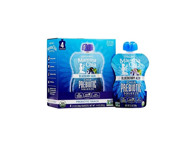 - (1) Mamma Chia Organic Prebiotic Squeeze Snack, Blueberry Acai, Fiber-Rich Prebiotic Gut Support,USDA Organic, Non-GMO, Vegan, Gluten Free, 3.5 Ounce (Pack of 4)