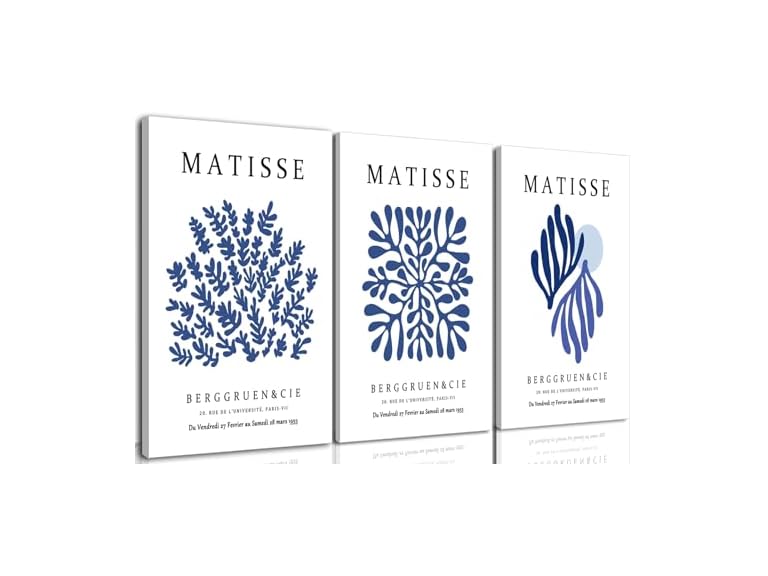 - 1.Matisse Wall Art: The Blue Matisse Wall Art Framed Set of 3 features abstract navy blue leaves, inspired by Henri Matisse,This minimalist wall art brings a modern aesthetic touch to your space.This set of 3 abstract navy blue flower poster prints embodies minimalist aesthetic and modern artwork, making it a timeless addition to any interior.