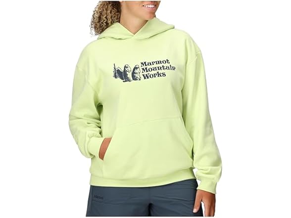 This midweight blend of cotton and recycled polyester embodies your outdoor lifestyle, with a softness that's ideal for pre/post activity or hanging by camp, and featuring a heritage Marmot mountain works logo. The Marmot Mountain Works Hoody is here to out-cozy all the competition. It goes on first thing in the morning for a dog walk, coffee run, or a stoke of last night's campfire, and it's the last thing you take off, if you take it off at all, before you hit the hay or the side zips on the sleeping bag. The softness of a midweight blend of cotton and recycled polyester pairs well with a cup of joe, or a campfire nightcap. It's the sweatshirt that's never more than an arm's length away, from the crag, to the couch, to the trunk of your car, at the ready to warm you up or comfort your cool down.