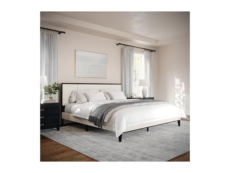 - (1) Martha Stewart Jett Platform Bed with Headboard, Fabric Upholstered Inset Headboard and Base, Solid Wood Frame, No Box Spring Needed, King, Dark Brown/Beige