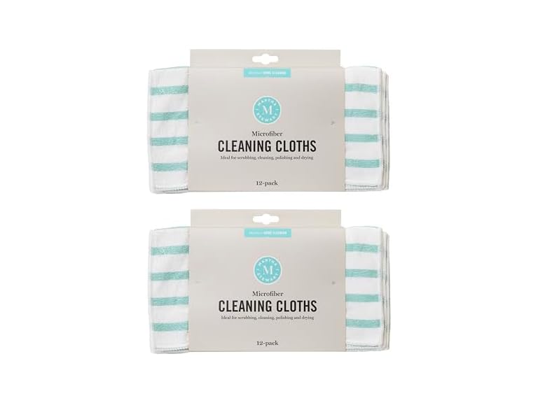 - (1) Martha Stewart Microfiber Cleaning Cloths, Ultra-Absorbent, Lint-Free Cleaning Towels for Home & Kitchen, Teal Stripes, 11 Inches, 24 Count
