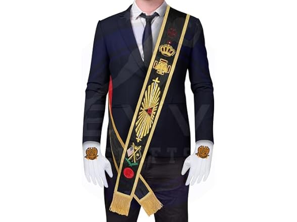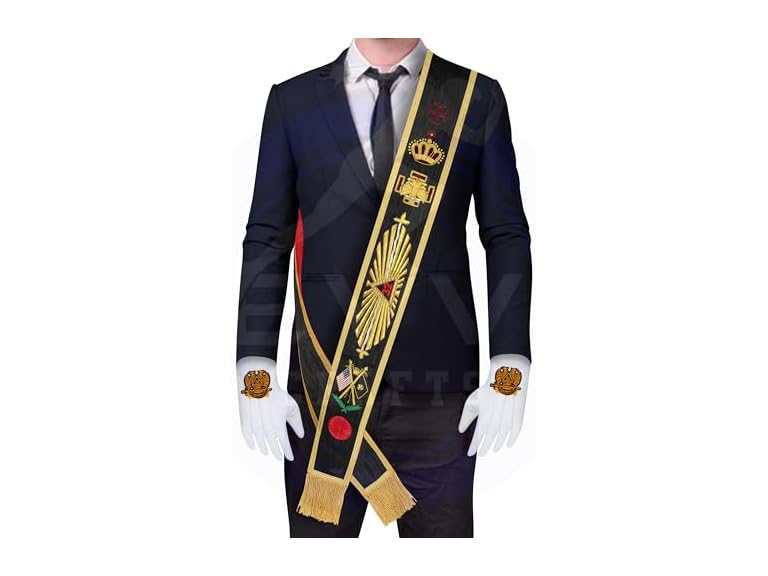 This Masonic Scottish Rite 32nd Degree Rose Croix Shoulder Sash is designed to reflect the highest level of Masonic tradition and craftsmanship. The sash is made from premium materials, featuring a classic black design with gold bullion embroidery, symbolizing the distinguished 32nd Degree of the Scottish Rite. The sash measures 44 inches in length and 4.5 inches in width, providing a comfortable and dignified fit for ceremonial use. The inside is lined with luxurious satin fabric, adding a touch of refinement. This set comes with a free handmade leather embroidered sash case, which is both practical and stylish. Measuring 18 inches in length and 7 inches in width, the case is designed to securely store your sash. It also features a zipper pocket for gloves and a convenient strap for hanging on the shoulder, making it easy to carry during Masonic events. Included with the set is a pair of white gloves in a large standard size, with a machine-embroidered logo, ensuring you look sharp and professional. These accessories, provided for free, make this set ideal for any 32nd Degree Freemason. Whether for ceremonies or as part of your regalia collection, this Masonic Scottish Rite Rose Croix Shoulder Sash is the perfect combination of elegance, functionality, and tradition.