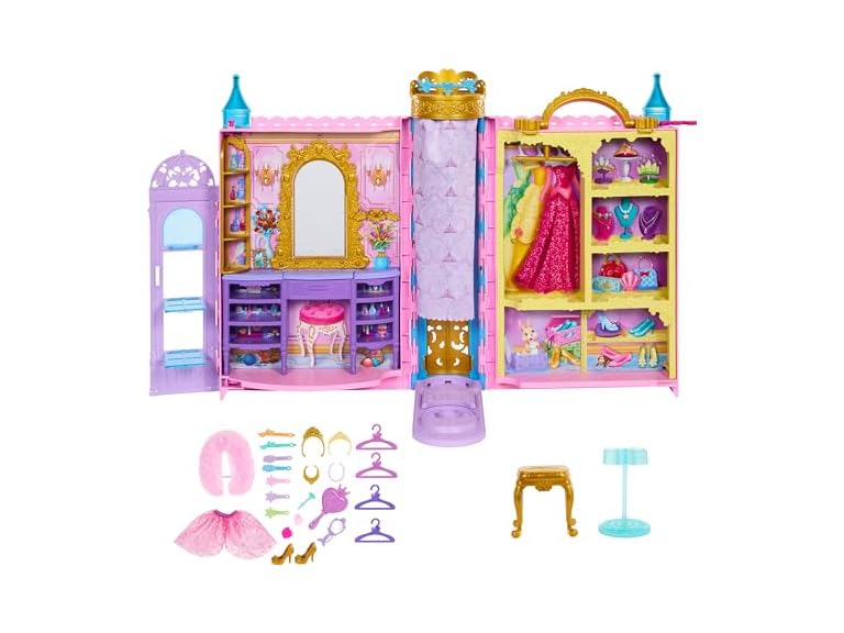- Mattel Disney Princess Toys, Ready for The Ball Closet Playset Opens to 2 Feet Wide & Includes 2 Fashions, 25 Accessories, Storage & More